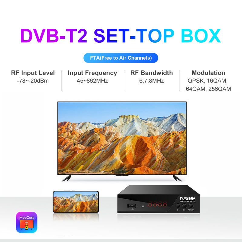 DVB-T2, FTA, HD, HEVC, H.265, MeeCast, USB PVR, EPG, USB Wi-Fi, IPTV, Youtube, MeeTube, Tiktok, Online Upgrading |