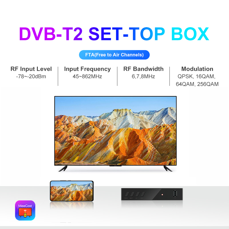 DVB-T2, FTA, HD, MeeCast, USB PVR, EPG, USB Wi-Fi, IPTV, Youtube, MeeTube, Tiktok, Online Upgrading