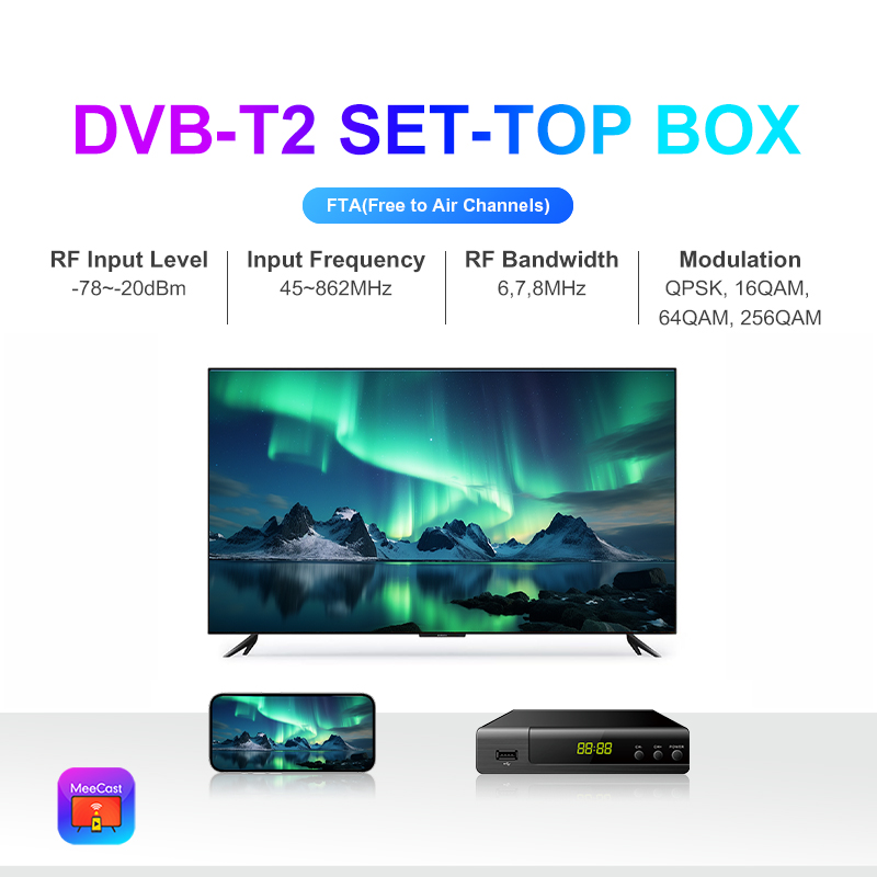 DVB-T2, FTA, HD, MeeCast, USB PVR, EPG, USB Wi-Fi, IPTV, Youtube, MeeTube, Tiktok, Online Upgrading