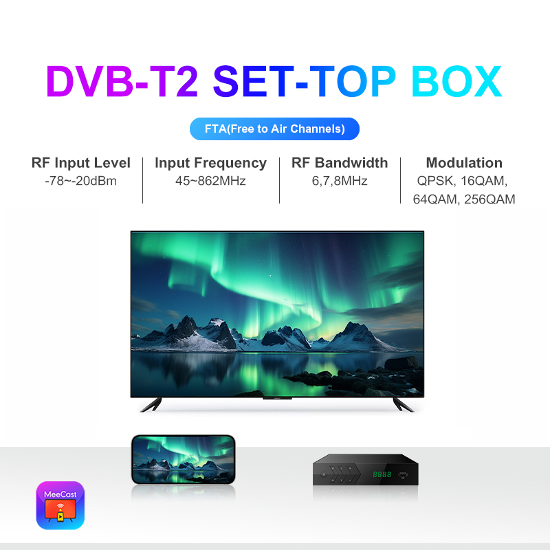 DVB-T2, FTA, HD, MeeCast, USB PVR, EPG, USB Wi-Fi, IPTV, Youtube, MeeTube, Tiktok, Online Upgrading