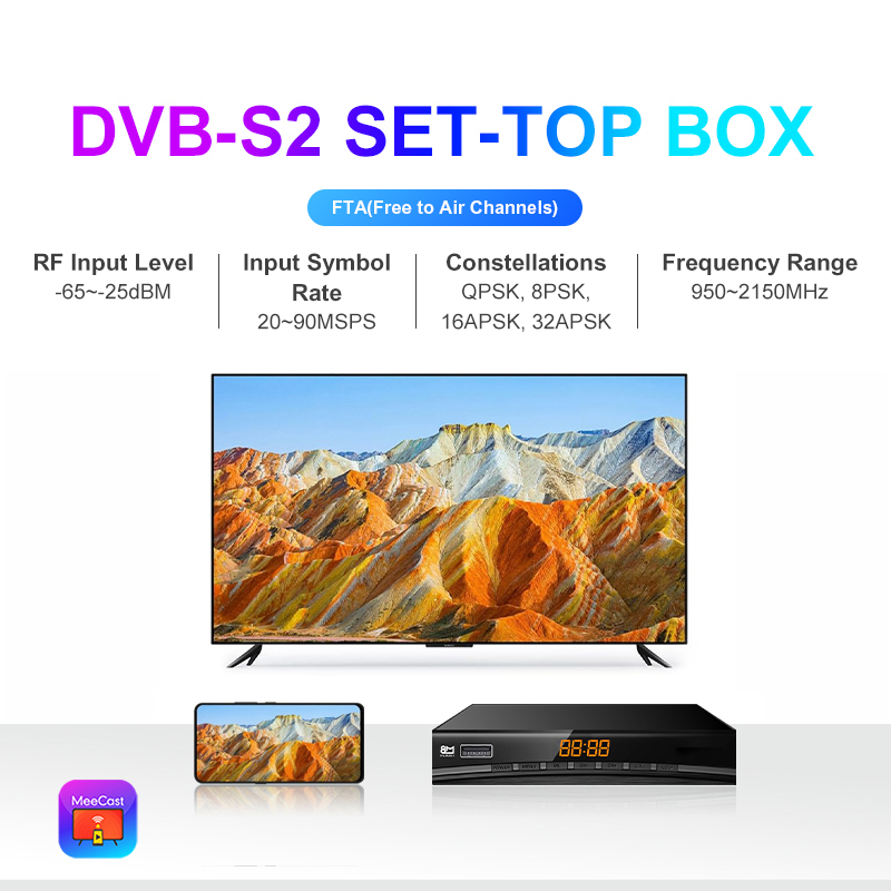 DVB-S2/S2X, FTA, HD, MeeCast, USB PVR, EPG, USB Wi-Fi, IPTV, Youtube, MeeTube, Tiktok, Online Upgrading, CAS optional