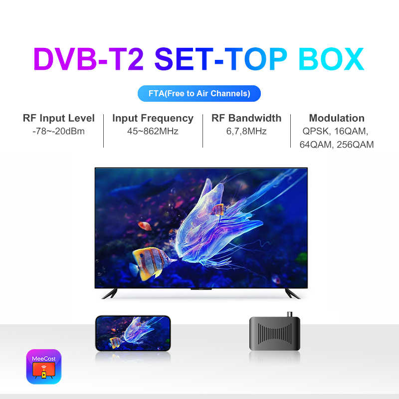 DVB-T2, FTA, HD, MeeCast, USB PVR, EPG, USB Wi-Fi, IPTV, Youtube, MeeTube, Tiktok, Online Upgrading