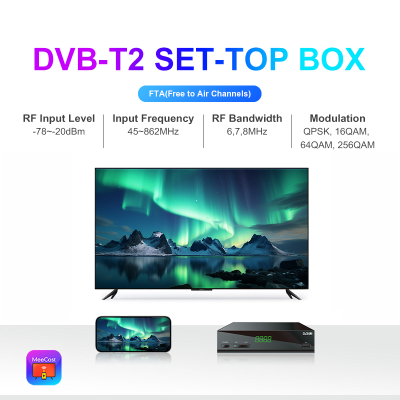 DVB-T2, FTA, HD, MeeCast, USB PVR, EPG, USB Wi-Fi, IPTV, Youtube, MeeTube, Tiktok, actualizare online