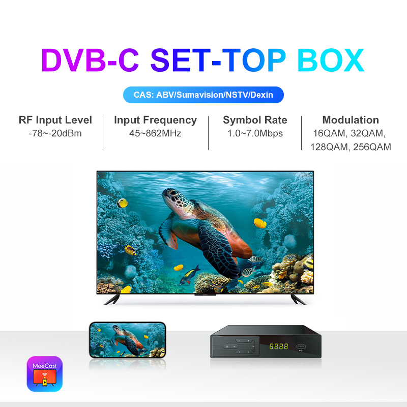 DVB-C, CAS(ABV, Sumavision, NSTV, Dexing), HD, MeeCast, USB PVR, EPG, USB Wi-Fi, IPTV, Youtube, MeeTube, Tiktok, Онлайн обновление |