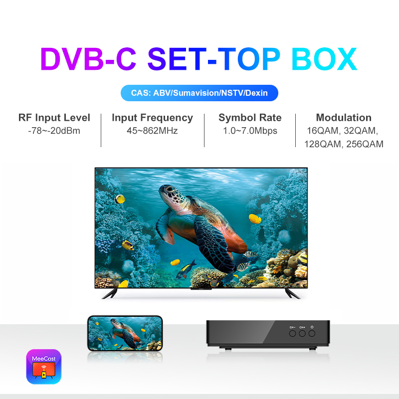 DVB-C, CAS(ABV, Sumavision, NSTV, Dexing), HD, MeeCast, USB PVR, EPG, USB Wi-Fi, IPTV, Youtube, MeeTube, Tiktok, Online Upgrading |
